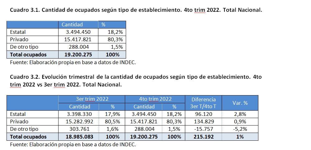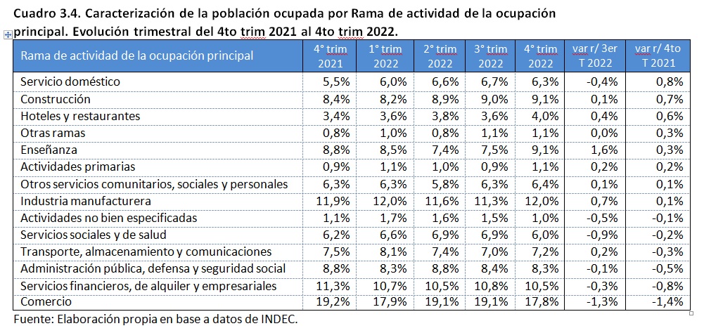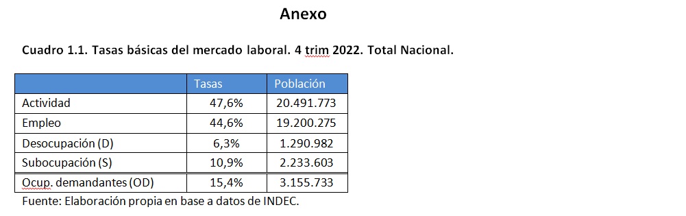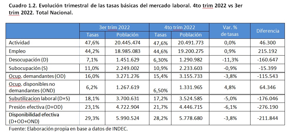 A continuación destacamos una serie de conclusiones que surgen de la reciente publicación de tasas e indicadores del mercado laboral argentino al cuarto trimestre 2022: