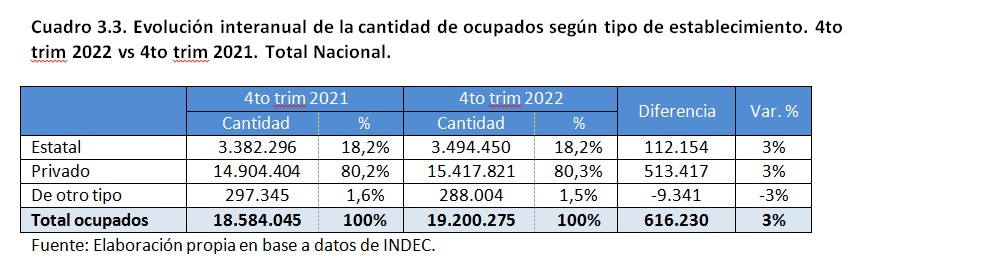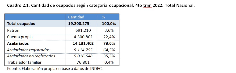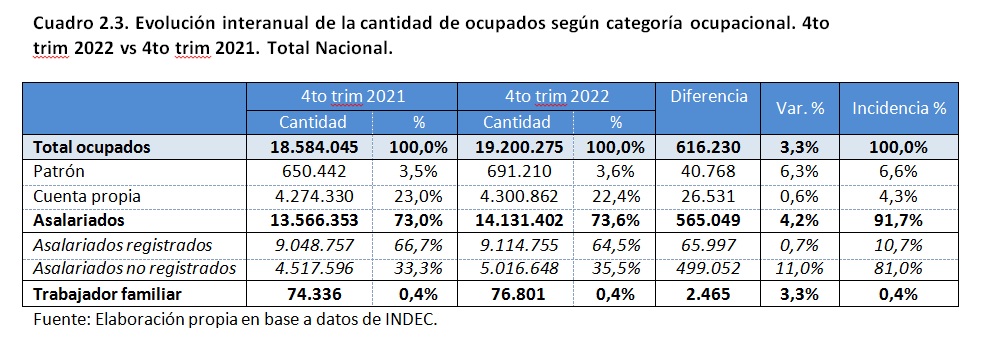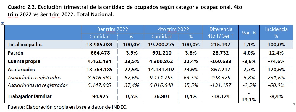 - Asimismo, la particularidad que presenta el 4to trimestre no llega a revertir el comportamiento del empleo acumulado a lo largo del año. Al analizar la evolución interanual se observa que el crecimiento del empleo (del 43,6% al 44,6%) fue explicado principalmente por el segmento de asalariados informales. Por lo tanto, la tasa de informalidad, si bien descendió respecto al trimestre anterior, se mantiene aún por encima del valor registrado en el mismo período del 2021 (33,3%). Así, el incremento en el empleo precario se sostiene como rasgo predominante en la creación del empleo durante el 2022.